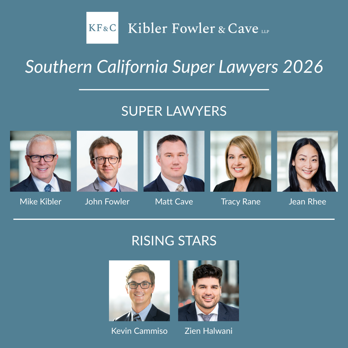 Los Angeles, CA, February 20, 2026 — Kibler Fowler & Cave is pleased to announce that several of its attorneys have been selected for inclusion in the 2026 Southern California Super Lawyers and Rising Stars lists, honoring outstanding lawyers who have achieved a high degree of peer recognition and professional achievement.